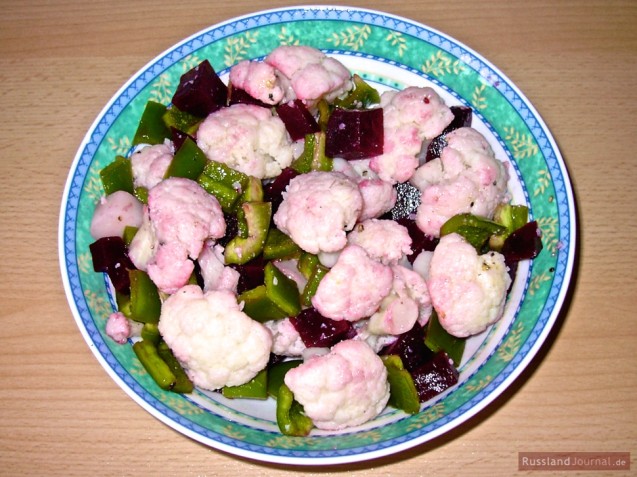 This low-calorie and vitamin-packed salad is made of cauliflower, beets and peppers and can be served as an appetizer or as an accompaniment to meat. The cauliflower is easy to digest and should not be cooked longer than 8-10 minutes. This way, it remains crisp and full of vitamins.